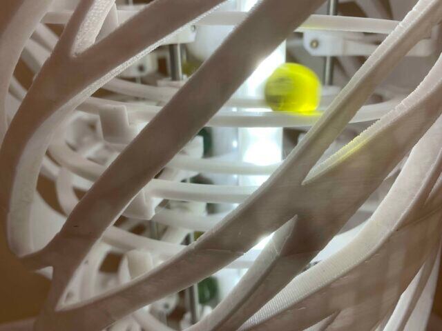 室内照明としての用途を前提としていますが、ランプシェードの中をボールが転がりますので装飾品としても楽しめます。照明はコントローラを内臓しており、明るさ調整、表示モードの選択ができます。