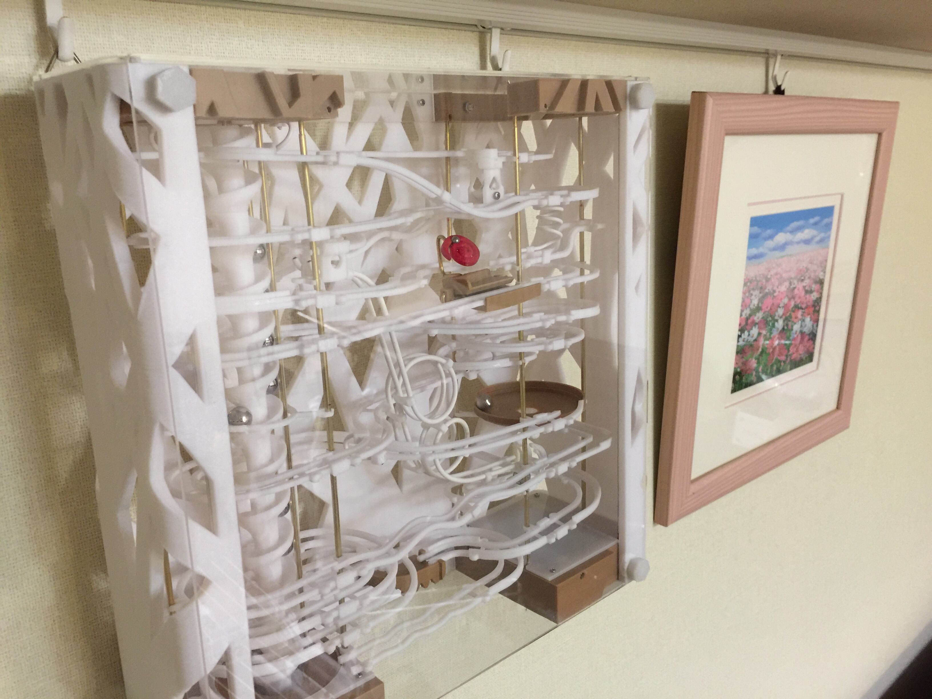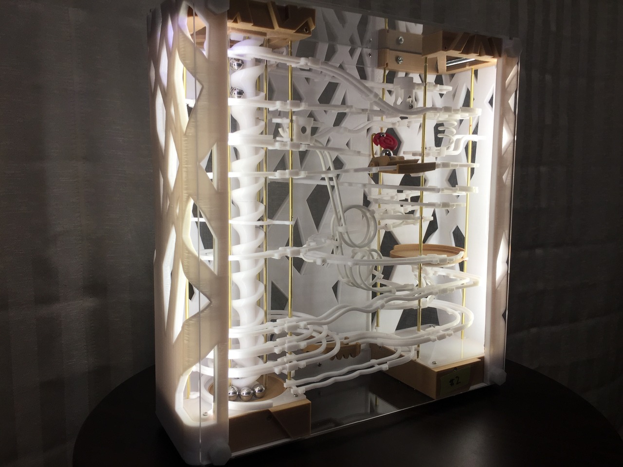 RBS#020は壁掛けタイプの作品です。3Dプリンターで造形した樹木パターンのフレームが特徴的です。新しいパーツとして垂直ループのトラックを導入しました。